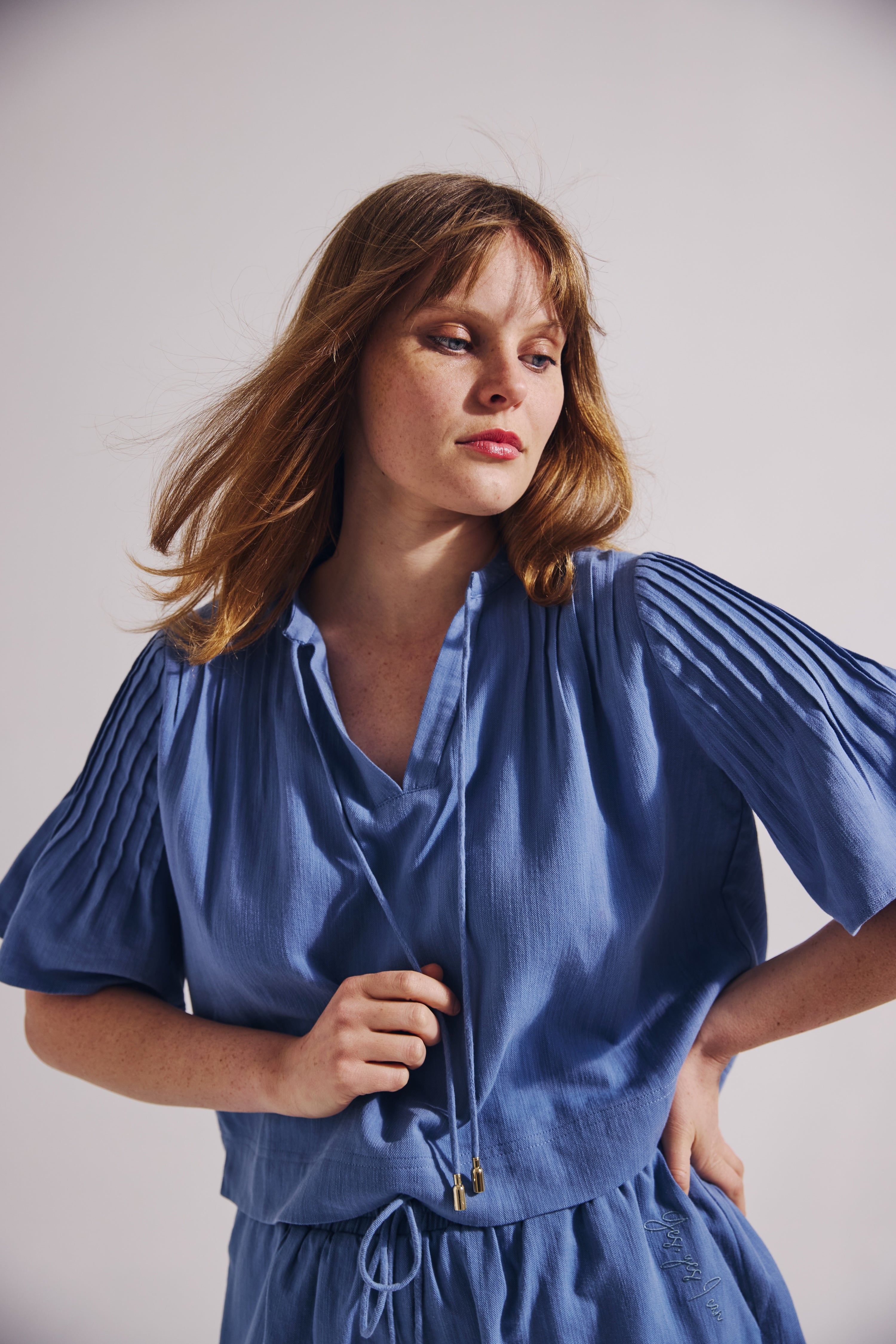- Short sleeves with gentle volume for a soft, draped shape